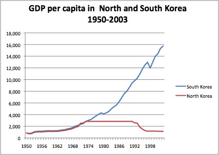 May mắn cho Nam Hàn là nó nghèo (tài nguyên) hơn Bắc Triều. GDP ngang nhao đến 1975, nhưng dân số Bắc Triều năm 1960 là 10 trẹo, dân số Nam Hàn là khoảng 25 trẹo. Nay Bắc 24- 25 trẹo, Nam 48 trẹo, tỉ lệ cũng không khác lắm.