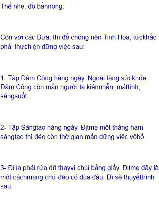 Tại sao có được những Hành Vi tinh hoa đó ? Đó là Cách Suy Nghĩ Tư Duy Tinh Hoa! Có được Tư Duy Tinh Hoa tự động nó phát sinh Hành Vi tinh hoa, đéo cần phải thuộc lòng là phải rửa đít với lại xỉa răng!