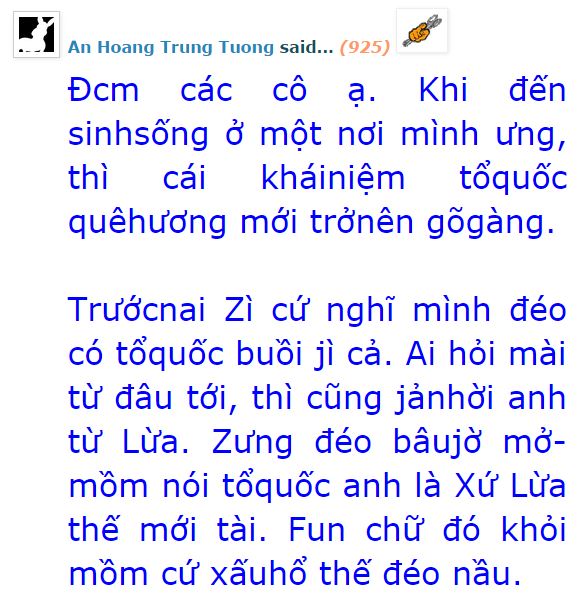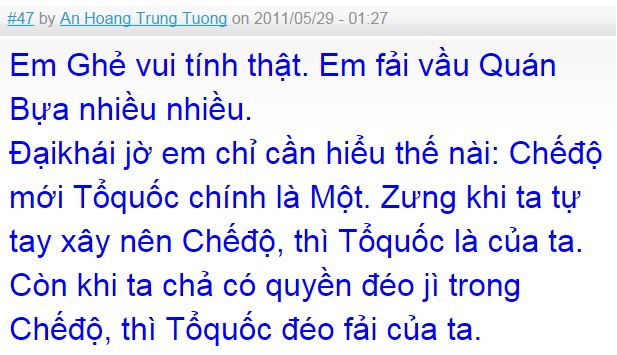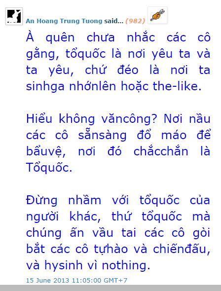 Thú thực đọc còm của anh Lão Bựa thật sảng khoái quá đi. Anh suốt ngày khoe bạn bè, dòng dõi...Không hiểu anh đùa hay thật nhưng xin rụt rè phản biện anh. Anh khoe anh con nhà ranh rá.! Như thế nào là danh giá hả anh? Bố mẹ anh chống tây giành lại độc lập dân tộc phỏng anh? Đấy là B nói thế, là bố mẹ anh và đồng đảng nói thế, rồi anh lặp lại như thế nhưng xin lỗi anh tôi nói bậy một chút, Chúng tôi đéo cần. Độc lập làm gì khi mà vẫn nghèo hèn như thế? Độc lập có làm cho vị thế của dân tộc anh cao hơn không? Tôi rất quan ngại anh a.Anh có vẻ rất tự hào khi được gọi là "Trỗi" phỏng anh? Nhưng xin lỗi anh vì các anh cũng đã có tuổi rồi, việc hội trường này khác ... chúng tôi ủng hộ và coi là lành mạnh tuyệt đối không phải vì truyền thống gì gì như các anh tưởng. Chẳng qua bố mẹ các anh là bọn phản loạn, chống đối chính quyền rồi tụ tập con cháu mình và đồng đảng cho đi học hành ...Cướp được chính quyền rồi tự phong nhau khác gì bọn Phun rô mà các anh vẫn chửi ? Anh có hiểu thế nào là tổ quốc không mà anh rống lên thống thiết thế? Tổ quốc anh là Châu Hoan, Châu Ái hay bao gồm cả Chiêm Thành? Có bao gồm đất Sài gòn nay anh đang sống không? Tôi dám chắc rằng anh sẽ trả lời tổ quốc anh liền một dải, từ mũi Cà Mau đến địa đầu Móng Cái phải không anh? Gì thì gì tôi cũng rất khâm phục tinh thần tự phê bình của anh : Lão Bựa ( 1027) : "Ngu ít người ta còn hiểu chứ ngu đén thiên tài thì chiệu mẹ."