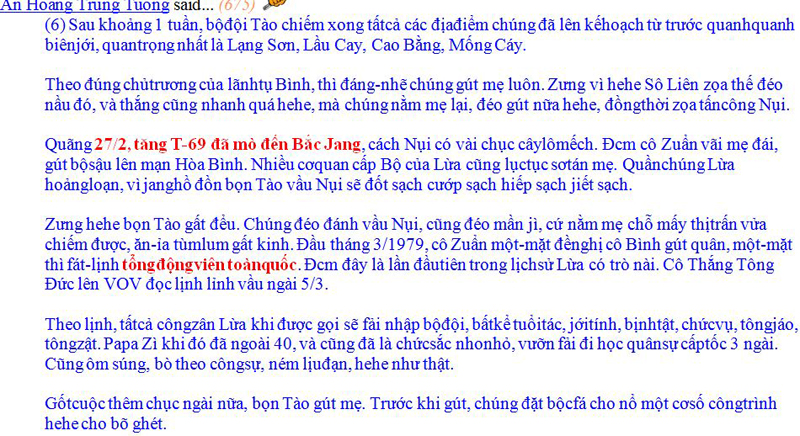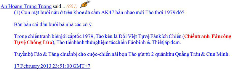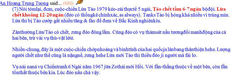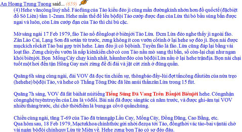 @Lão Bựa: lão zà-hói mà kể chiện biên-zới như cặc, tuyền dẫn-nhời cấp trên, đéo có tí-gì mắt-thấy-tai-nghe. Lão nên tắt mẹ loa cho rầu, thật.