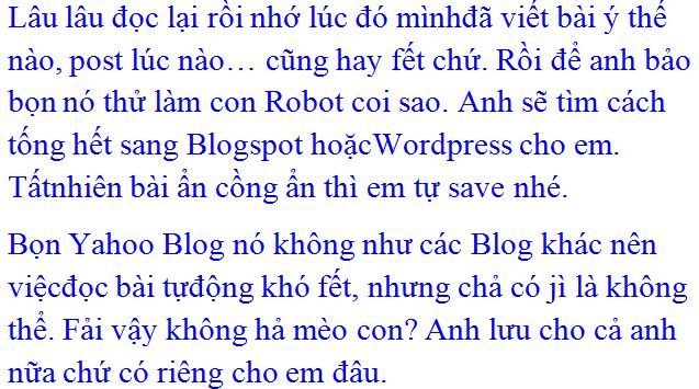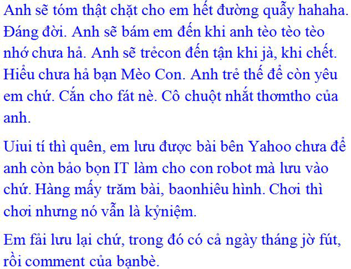Cuối ngày, cuối tháng, chia sẻ thêm 1 chút sến nho nhỏ của mùa cũ vậy. Đọc lại mail cũ thấy tác giả mail có nhắc đến sự kiện Yahoo Blog chấm dứt vĩnh viễn hoạt động tại VN. Mà bùi ngùi khi nhớ lại 1 thời gắn bó với yahoo, từ yahoo 360 độ, rồi yahoo plus, rồi Yahoo Messenger.