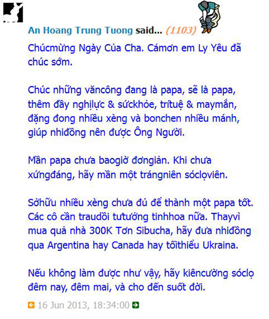 Nhưng rồi, thì gian như một mũi tên xé gió, mạnh mẽ, lạnh lùng đủn đít con đi. Con hết oán mất tiêu, thậm chí rất thương Pa. Thương, cho những gì Pa ko biết phải làm sao, ko hiểu như thế nào, mà phải chịu đựng. Con biết vì Pa, con có thiệt có hơn. Nhưng con yêu Pa, đến độ trong mắt con chả còn gèn mắt, chỉ còn cầu vồng.