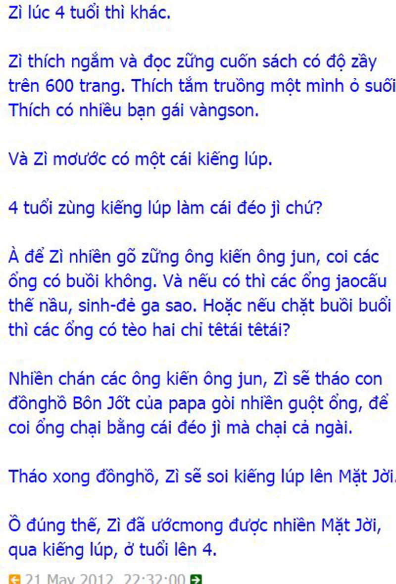 Zùn vẫn diện ăntheo aka xin xèng pama nên fải theo ý pama dù sai or dúng. Zùn cần tủ lạnh doctài ( có dường lối dúng) và thời gian dủ zài ( hoctap jankhổ ) dể thành người thanhniên doclap.