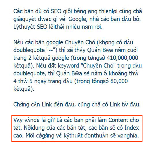 Trong bài đó, tôi cũng có nói là cá nhân tôi thì chán SEO rồi, không tha thiết nữa vì nó cũng chẳng nước non gì lắm, ít ra là trong trường hợp của tôi và đồng bọn mình.