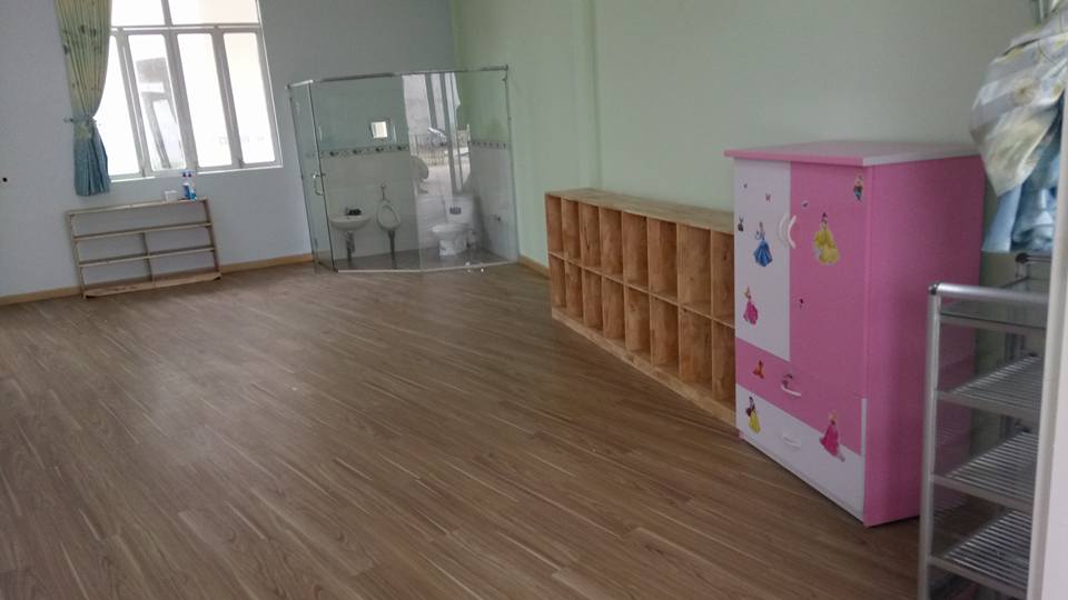 Phòng-học déo gì, mà sàn gạch-men cứng như quèo, hàinhi déo lăn-bò dược.