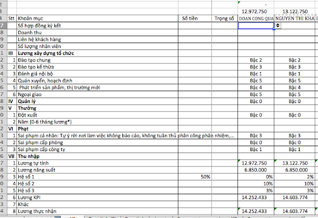 Đó là, thay vì trả lương theo cách truyền thống, tức mỗi tháng các cô được thoả thuận một cục xèng, dù có làm ít hay nhiều, thái độ tốt xấu,...thì cũng cục xèng đó, anh Cert chia ra thành các khoản mục biểu hiện qua tầm 100 tiêu chí, với mỗi tiêu chí có 7 bậc đánh giá,