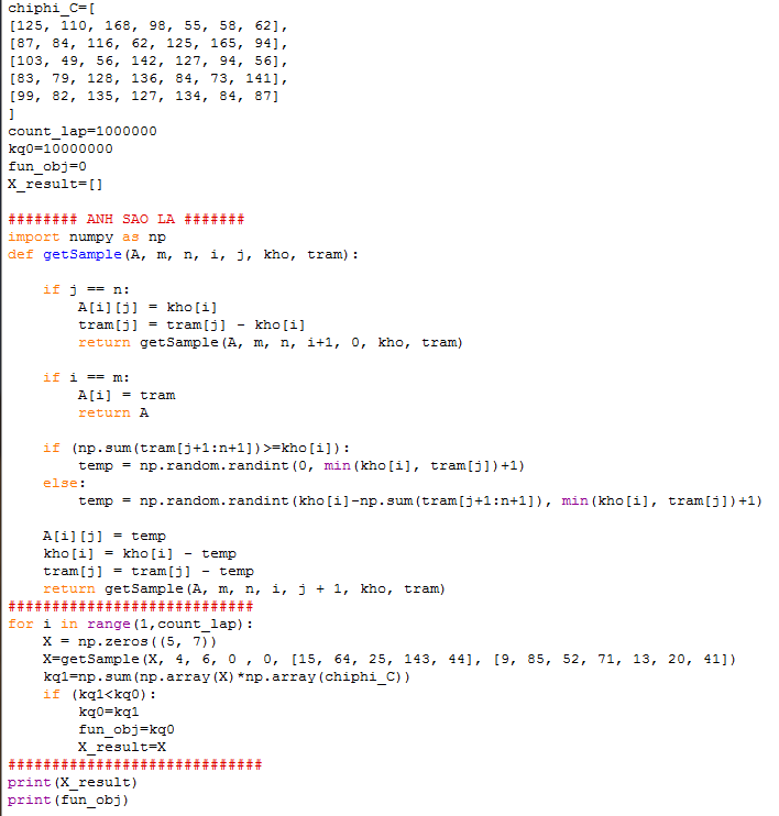 Việc mỗi phần tử nhận giá trị từ [0,143+1] cho all 5x7=35 phần tử trong [X] để thỏa mãn 2 hệ ràng buộc nối tiếp nhau là rất khó, xác suất tìm được [X] là rất nhỏ. (Nhẽ chạy cả trăm bịch Montecarlo, aka chọn ma trận [X] ngẫu nhiên hàng trăm tỷ lần mới có [X] phù hợp)