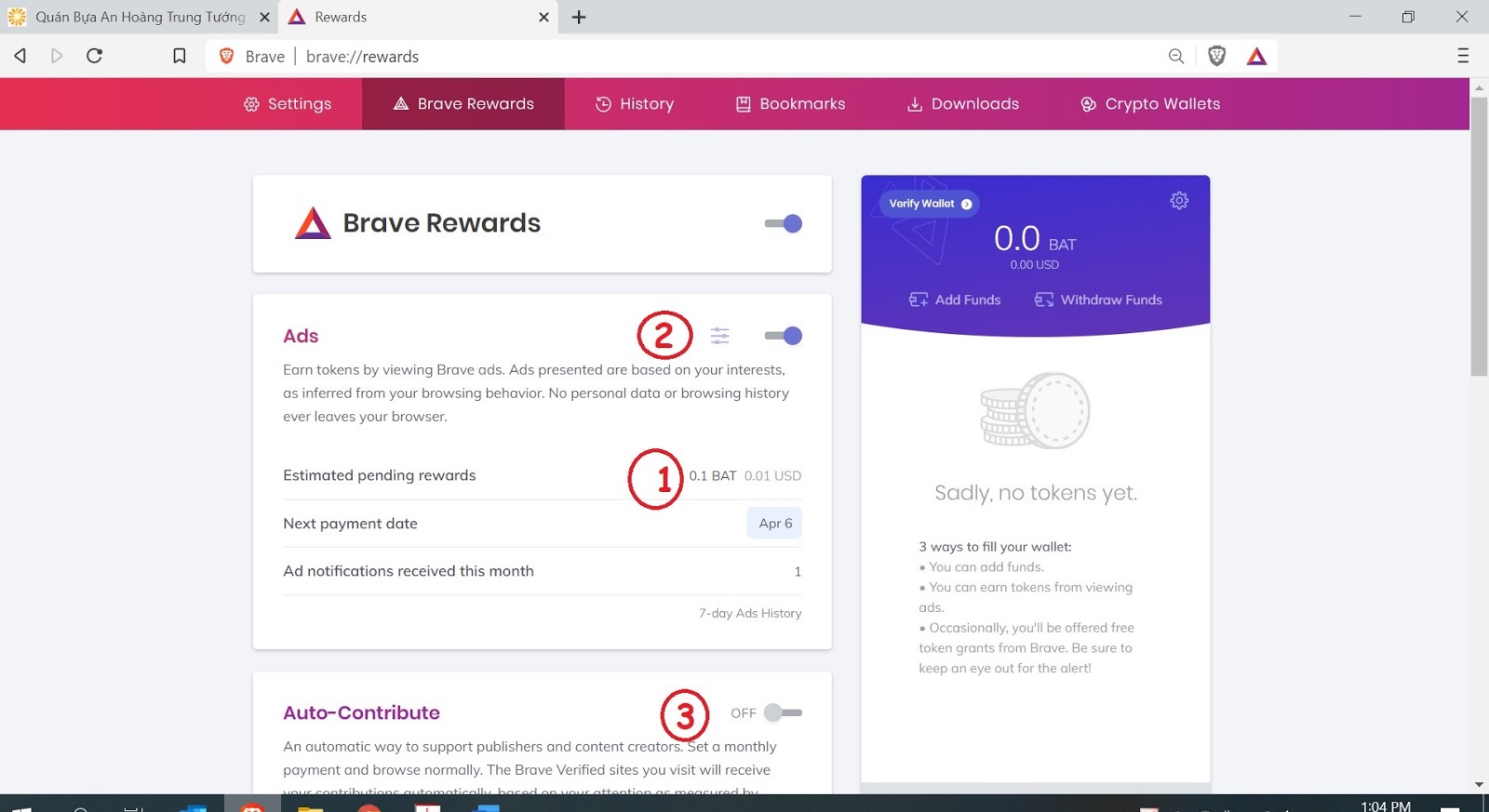 Cô nên vào chỉnh cho nó tăng lên "5 ads per hour" chổ số 2 trong hình anh, và gạt tắt "Auto-Contribute" chổ số 3