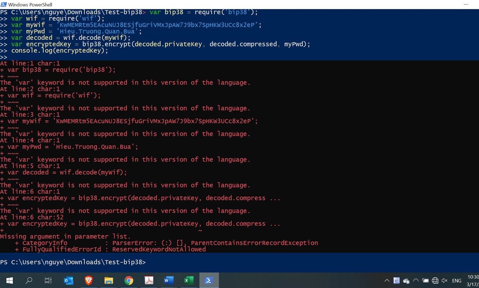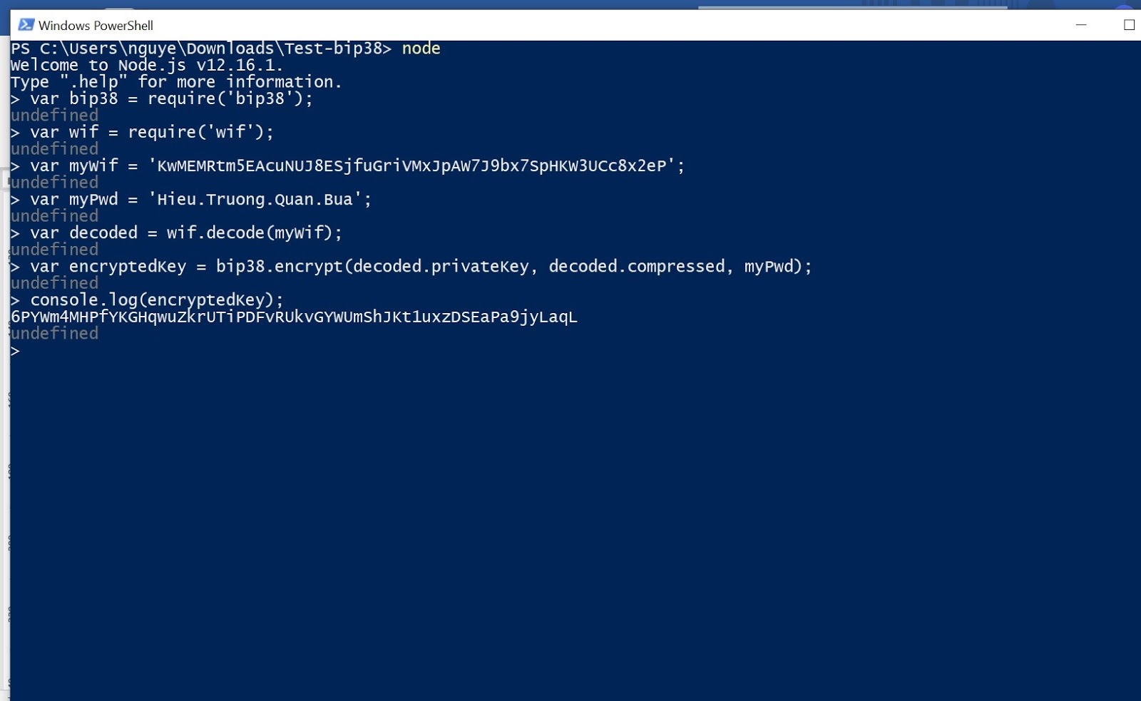 Nhờ Zì xem dùm sao em không mã hóa Private Key bằng bip38 qua NodeJS với các zòng lệnh này được nhỉ:
