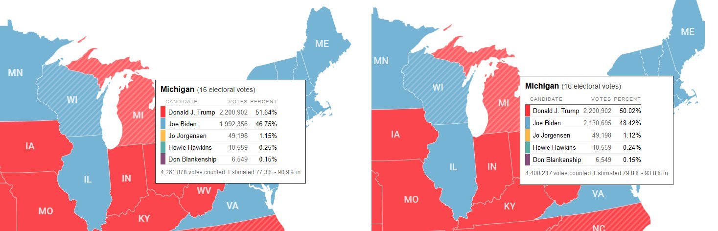 Vấn đề là Georgia chúng đếm đến 94% chúng đéo đếm nữa mà nghỉ trong khi mọi năm chúng sẽ đếm hết. Chúng dừng để có thời gian tuồn phiếu vào mà. Phiếu qua mail chung đếm cùng lúc từ sáng nay đa số phải xong trước rồi chứ không chênh lêch nhiều đâu.