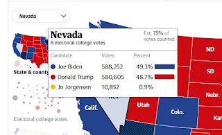 Joe đầu bò dang dẫn trước Michigan và Nevada. Nếu Joe đầu bò mà thắng 2 tiểu bang này thì đạt đúng 270 phiếu vừa đủ để hạ đối thủ Trump mặt ngựa. Trận đấu vẫn còn đang gay go vì Nevada mới kiểm 67% số phiếu nên chưa biết ai sẽ về đích trong cuộc nhạy đua này. Cố lên Joe đầu bò;-)
